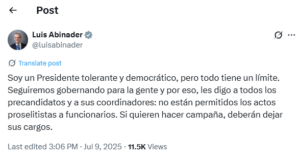 El presidente Luis Abinader publicó este martes un enérgico mensaje dirigido a los funcionarios públicos que aspiran a cargos electivos, dejando claro que no permitirá actos proselitistas mientras ocupen posiciones en el gobierno.
