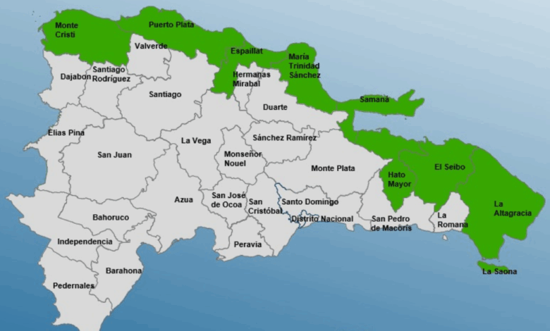 Las provincias afectadas por la alerta verde son: La Altagracia, Hato Mayor, Espaillat, Montecristi, El Seibo, Samaná, María Trinidad Sánchez y Puerto Plata.