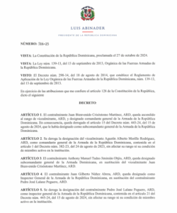 Santo Domingo.-El presidente Luis Abinader emitió el Decreto núm. 516-25, mediante el cual se realizaron importantes cambios en la estructura de mando de la Armada de la República Dominicana.